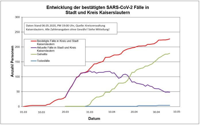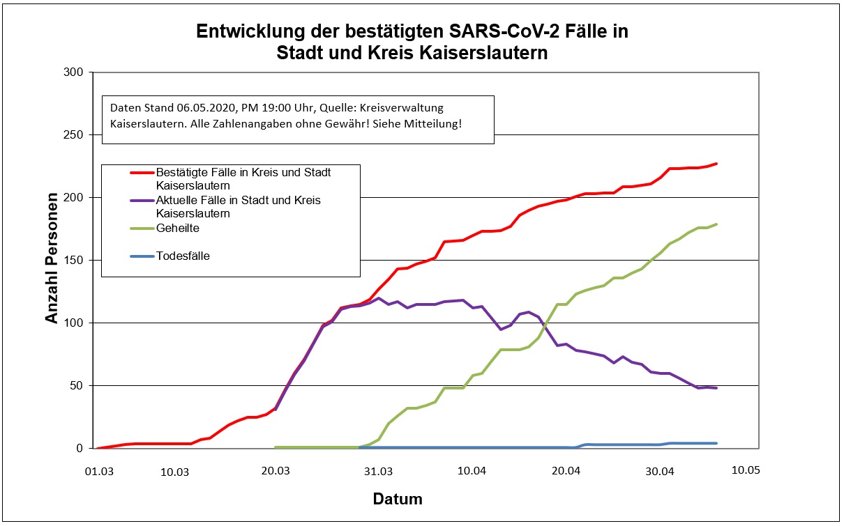 Am 06.05. wurden zwei positiv-getestete Personen aus der Stadt Kaiserslautern gemeldet und drei Personen sind genesen. Die Zahl der Genesenen liegt momentan bei 179 Personen.