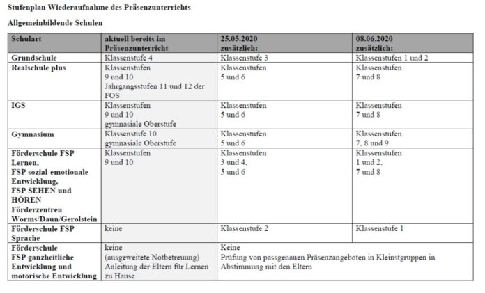 „Unser Fahrplan für die Schulöffnungen ist klar und gut. Wir wissen aber auch, dass dieser Fahrplan sich nicht 1 zu 1 auf alle Schulen im Land übertragen lässt. Wir haben ganz kleine Schulen in Rheinland-Pfalz mit 50 Schülerinnen und Schülern bis hin zu großen Systemen mit mehreren Tausend Lernenden. Für all diese Systeme brauchen wir tragfähige Lösungen. Alle – Schulen, Lehrkräfte, die Schulträger, die Schulaufsicht und das Bildungsministerium – arbeiten zusammen, so dass vor Ort die Lösung gefunden werden kann, die gut und sicher trägt. Für uns ist wichtig, dass die Schulen, aber auch die Eltern Planungssicherheit bekommen. Wir stellen jetzt sicher, dass tatsächlich alle Schülerinnen und Schüler vor den Sommerferien wieder zurück in die Schule kommen können“, so die Bildungsministerin.