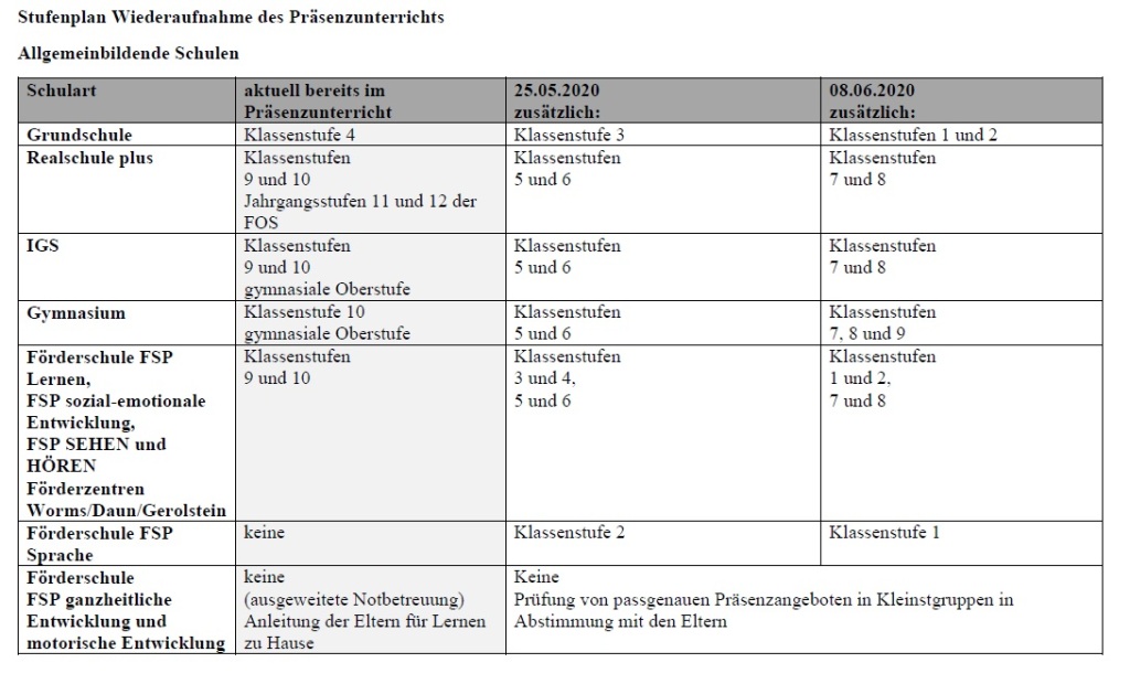 Geplant ist, dass am 18. Mai die Berufsbildenden Schulen weiter starten. An den allgemeinbildenden Schulen werden zum 25. Mai weitere Klassen- und Jahrgangsstufen an die Schulen zurückkehren. So sollen am 25 Mai beispielsweise die dritten Klassen der Grundschulen sowie die 5. und 6. Klassen der Orientierungsstufe der weiterführenden Schulen folgen. Im Anschluss soll es in Zwei-Wochen-Schritten zu weiteren Öffnungen kommen: Am 8. Juni folgen beispielsweise die achten Klassen, sodass bis Mitte Juni alle Schülerinnen und Schüler wieder in den Schulen sein können, wenn es das Infektionsgeschehen zulässt.