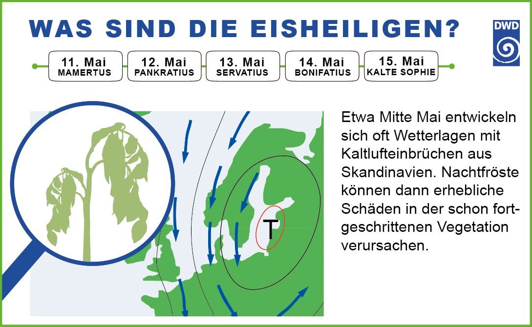 Spielen die Eisheiligen im Wettergeschehen des Monats Mai eigentlich noch eine Rolle? Jedes Jahr fragt man sich, kommen sie pünktlich, kommen sie überhaupt? Sie heißen Mamertus, Pankratius, Servatius, Bonifatius und Sofia und haben uns früher oft den Frühling verhagelt. Die Eisheiligen, das ist der Zeitraum vom 11. bis 15. Mai, in dem nach Aufzeichnungen des Deutschen Wetterdienstes (DWD) bis Mitte des 19. Jahrhunderts immer wieder Kaltlufteinbrüche beobachtet wurden.