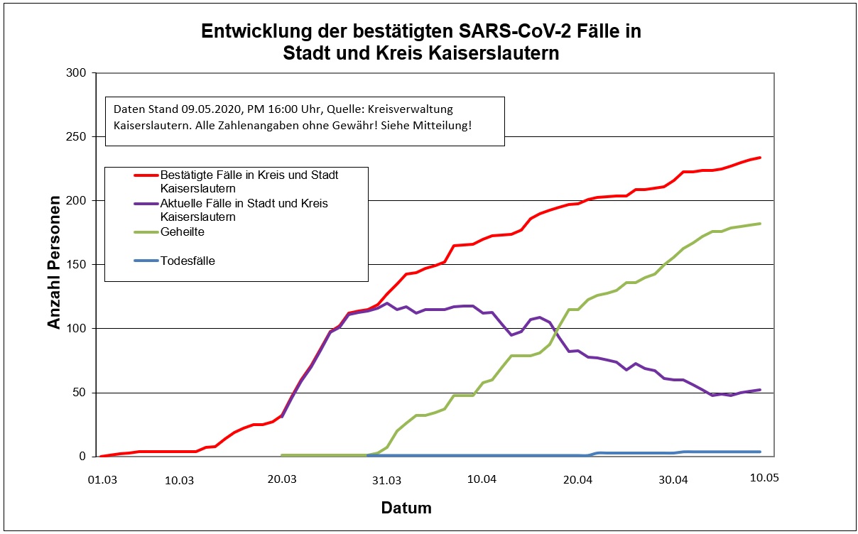 Zurzeit gibt es 234 Indexfälle in Stadt und Landkreis Kaiserslautern. Aufgrund landeseinheitlicher RKI-Vorgaben werden die 182 genesenen Personen und die mittlerweile 4 Todesfälle jedoch weiter in der Gesamtstatistik der positiven Fälle weiter mitgeführt.