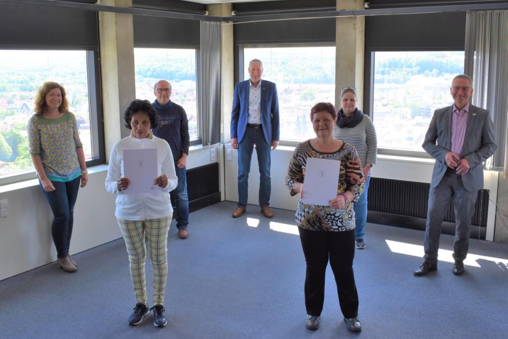 Monika Quarz und Hanna Abraha-Iassou haben zusammen fast 47 Jahre für die Stadt gearbeitet. Monika Quarz nahm ihre Tätigkeit im Rathaus im Jahr 2000, ihre Kollegin Hanna Abraha-Iassou sogar im Jahr 1997 auf. Beide wurden aufgrund ihrer guten Leistung als Reinigungskräfte bei der Verwaltung eingestellt und vom Beigeordneten Peter Kiefer nun offiziell in den Ruhestand verabschiedet. „Ich möchte mich bei Ihnen für Ihre langjährige Verbundenheit und ihre gute Arbeit über all die Zeit sehr herzlich bedanken“, erklärt Kiefer. Im Beisein von Referatsleiter Gebäudewirtschaft, Udo Holzmann, der für die Reinigung zuständigen Gruppenleiterin Tanja Feldmann, der stellvertretenden Leiterin des Referats Personal, Karin Woll, sowie Fritz Bußer als Vertreter des Personalrats überreichte der Beigeordnete den scheidenden Mitarbeiterinnen ihre Verabschiedungsurkunden.