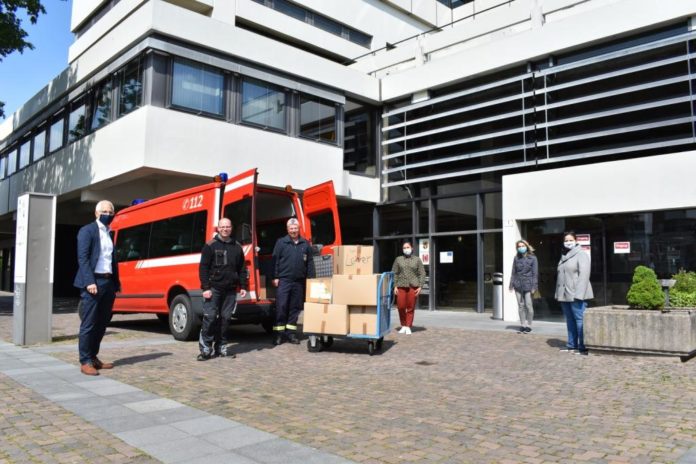 Die Masken wurden heute Morgen von Schulreferatsleiter Peter Krietemeyer (links im Bild) sowie weiteren Mitarbeiterinnen des Schulreferats und des Referats Gebäudewirtschaft am Rathaus in Empfang genommen, wo sofort die Weiterverteilung begann.