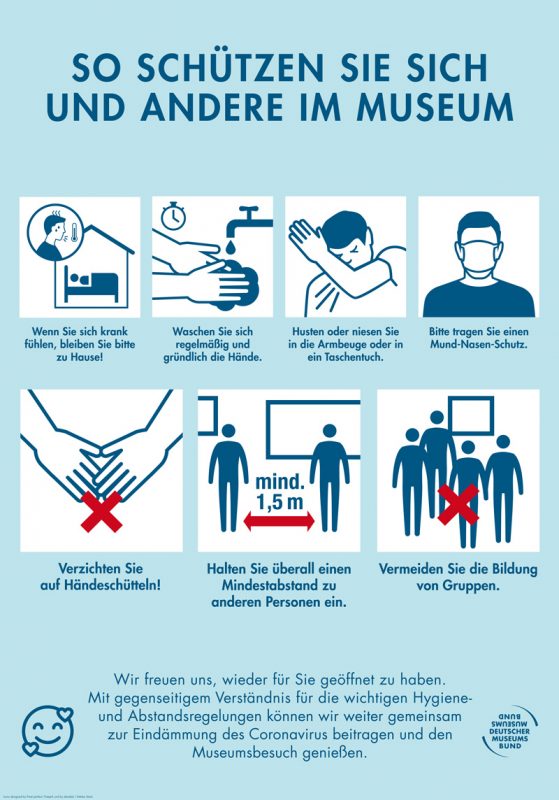 Wir bitten Besucher ausdrücklich darum, sich mit den geltenden Sicherheitsregeln auseinanderzusetzen und sich an die genannten Vorgaben zu halten und weisen explizit darauf hin, dass das Museum bei Nichtbeachtung nicht besucht werden kann.