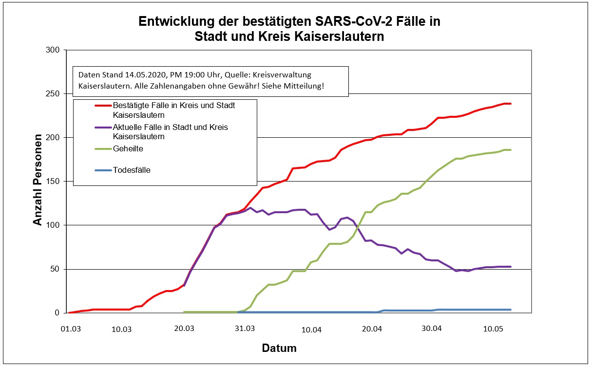 Zurzeit gibt es 239 Indexfälle in Stadt und Landkreis Kaiserslautern. Aufgrund landeseinheitlicher RKI-Vorgaben werden die 186 genesenen Personen und die mittlerweile 4 Todesfälle jedoch weiter in der Gesamtstatistik der positiven Fälle weiter mitgeführt.