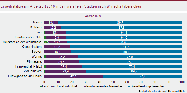 In den kreisfreien Städten sind knapp vier Fünftel aller Erwerbstätigen in den Dienstleistungsbereichen tätig; etwa ein Fünftel hat einen Arbeitsplatz im Produzierenden Gewerbe. Mit einem durchschnittlichen Erwerbstätigenanteil von 0,5 Prozent hat der Bereich „Land- und Forstwirtschaft, Fischerei“ in den Städten nur eine sehr geringe Bedeutung. Den höchsten Anteil an Erwerbstätigen im Produzierenden Gewerbe gibt es in Ludwigshafen (2018: 42 Prozent). Dagegen sind in Mainz 90 Prozent aller Erwerbstätigen in Dienstleistungsbereichen beschäftigt.
