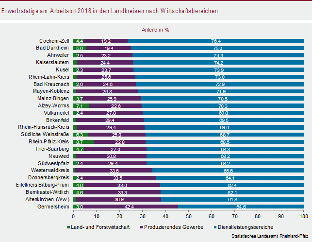 In den Landkreisen liegt der durchschnittliche Anteil der Dienstleistungsbereiche mit 69 Prozent deutlich niedriger als in den kreisfreien Städten. Gut 28 Prozent der Erwerbstätigen in den Landkreisen sind im Produzierenden Gewerbe tätig. Im Bereich „Land- und Forstwirtschaft, Fischerei“ arbeiten durchschnittlich 3 Prozent der Erwerbstätigen. Einen besonders großen Anteil hat das Produzierende Gewerbe mit 42 Prozent im Landkreis Germersheim. Im Kreis Cochem-Zell arbeiten dagegen 19 Prozent der Erwerbstätigen im Produzierenden Gewerbe; hier stellen die Dienstleistungsbereiche mehr als drei Viertel der Arbeitsplätze. Den höchsten Erwerbstätigenanteil in der Landwirtschaft weist der Rhein-Pfalz-Kreis mit 8,7 Prozent auf.