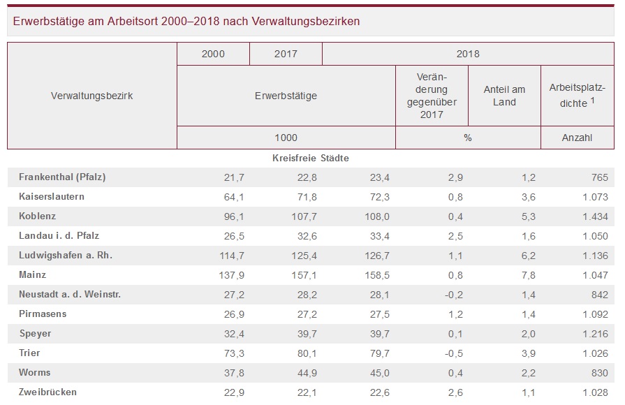 Die Zahl der Erwerbstätigen ist nach Angaben des Statistischen Landesamtes in Bad Ems 2018 in den Landkreisen mit einem Prozent etwas stärker gestiegen als in den kreisfreien Städten mit 0,8 Prozent. In den meisten kreisfreien Städten und Landkreisen nahm die Erwerbstätigkeit zu; lediglich in zwei kreisfreien Städten sowie sechs Landkreisen nahm sie ab. Insgesamt erhöhte sich die Zahl der Erwerbstätigen mit Arbeitsort in Rheinland-Pfalz 2018 um 0,9 Prozent auf gut 2,03 Millionen.
