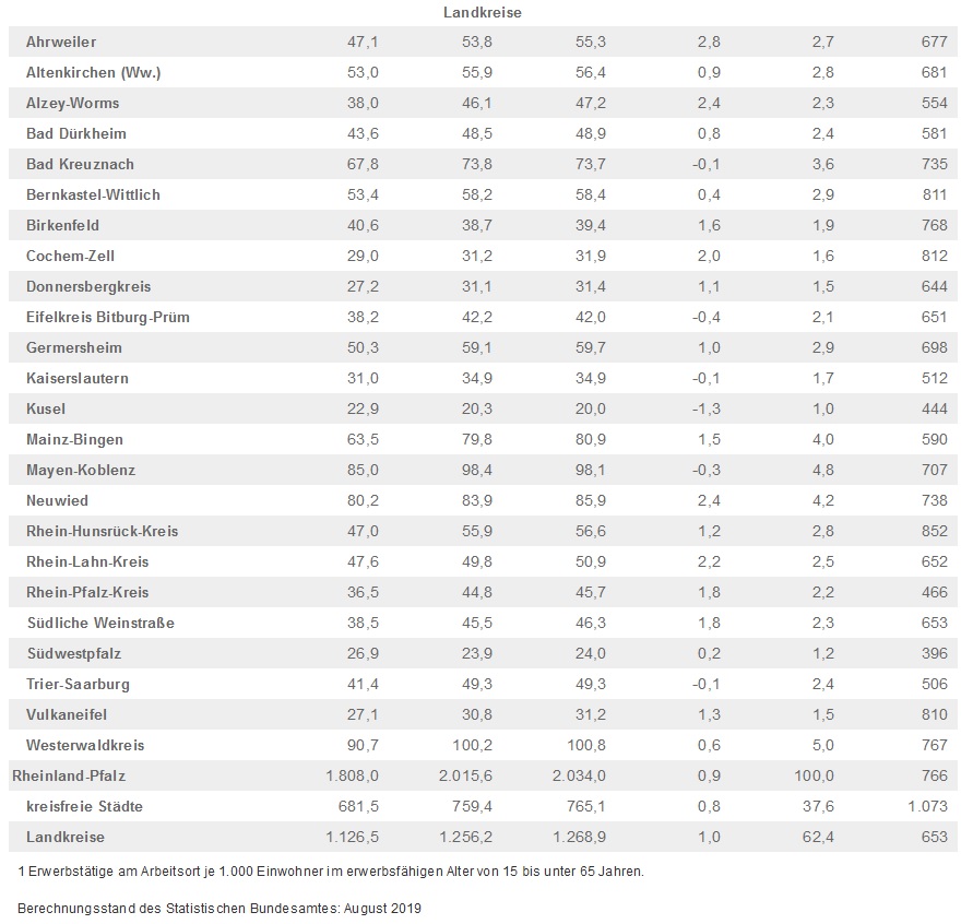 Davon arbeiteten 1,27 Millionen bzw. 62 Prozent in den 24 Landkreisen und 0,77 Millionen bzw. 38 Prozent in den zwölf kreisfreien Städten. Knapp ein Fünftel aller Erwerbstätigen in Rheinland-Pfalz arbeitete in den drei Städten Mainz, Ludwigshafen und Koblenz. Im Vergleich der Landkreise gab es die meisten Arbeitsplätze im Westerwaldkreis sowie in Mayen-Koblenz.