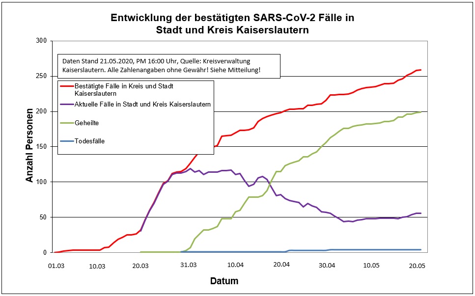 Am 21. Mai meldete das Labor 1 positiv getestete Person aus der Stadt Kaiserslautern und 1 Person aus der Stadt Kaiserslautern als genesen. Die Zahl der Genesenen liegt bei 199 Personen. Zurzeit gibt es 259 Indexfälle in Stadt und Landkreis Kaiserslautern. Aufgrund landeseinheitlicher RKI-Vorgaben werden die 199 genesenen Personen und die mittlerweile 4 Todesfälle jedoch weiter in der Gesamtstatistik der positiven Fälle weiter mitgeführt.