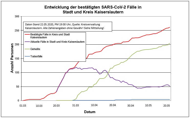 Am 22.Mai meldete das Labor 1 Neufall in der Stadt Kaiserslautern und 1 Neufall aus der Verbandsgemeinde Otterbach-Otterberg. Erfreulicherweise konnten dagegen 4 Personen aus der Stadt Kaiserslautern, sowie 1 Person aus der VG Ramstein-Miesenbach und 1 Person aus der VG Weilerbach aus der Quarantäne entlassen werden. Die Zahl der Genesenen hat sich somit auf 205 erhöht.