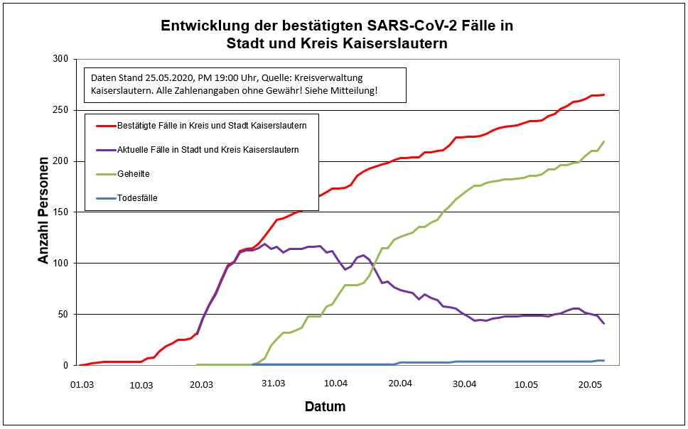 Das Labor meldete am 25. Mai eine positiv auf das Coronavirus getestete Person aus der Stadt Kaiserslautern. 8 genesene Personen aus der Stadt Kaiserslautern und 1 Person aus der VG Landstuhl konnten heute aus der Quarantäne entlassen werden. Die Zahl der Genesenen liegt momentan bei 219 Personen.