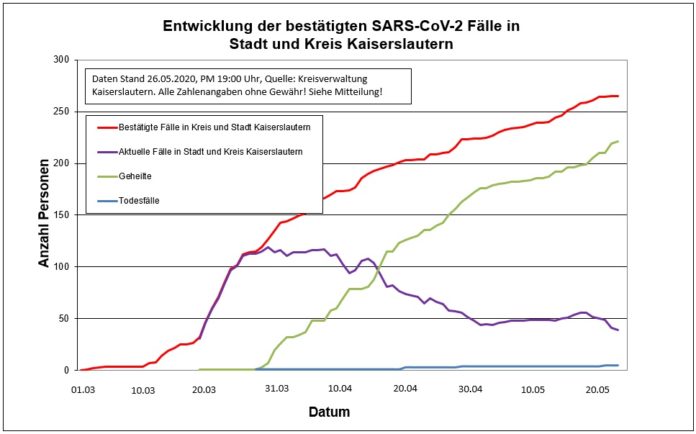 Zurzeit gibt es 265 Indexfälle in Stadt und Landkreis Kaiserslautern. Aufgrund landeseinheitlicher RKI-Vorgaben werden die 221 genesenen Personen und die mittlerweile 5 Todesfälle jedoch weiter in der Gesamtstatistik der positiven Fälle weiter mitgeführt.