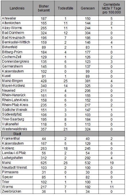 Die oben genannten Zahlen entsprechen den in der Meldesoftware des Robert Koch-Instituts übermittelten laborbestätigten Fällen einer COVID-19 Erkrankung mit Meldeadresse in Rheinland-Pfalz. Diese werden von den Gesundheitsämtern über die Landesmeldestelle beim Landesuntersuchungsamt an das Robert Koch-Institut übermittelt.