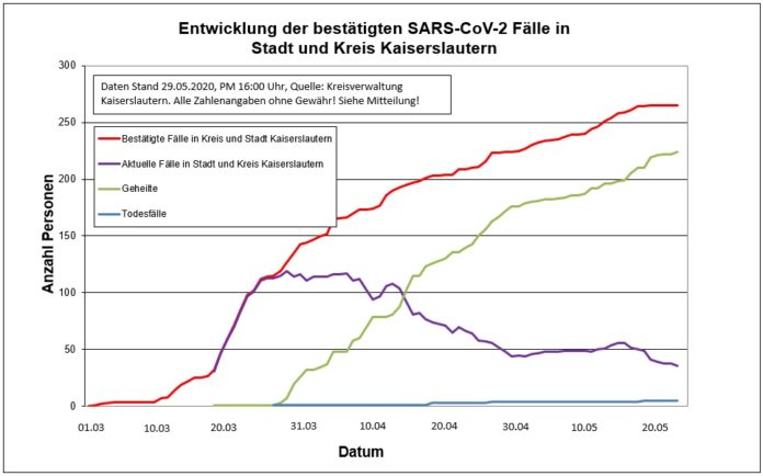 Der vierte Tag in Folge blieb ohne Neuinfizierte. Es konnten sogar 2 weitere Personen aus der Stadt Kaiserslautern aus der Quarantäne entlassen werden. Damit reduziert sich die Zahl der Infizierten auf 36 Personen.