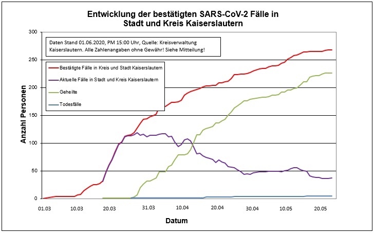Die Zahl der Genesenen liegt momentan bei 226 Personen. Zurzeit gibt es 268 Indexfälle in Stadt und Landkreis Kaiserslautern. Aufgrund landeseinheitlicher RKI-Vorgaben werden die 226 genesenen Personen und die mittlerweile 5 Todesfälle jedoch weiter in der Gesamtstatistik der positiven Fälle weiter mitgeführt.