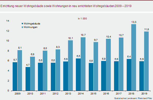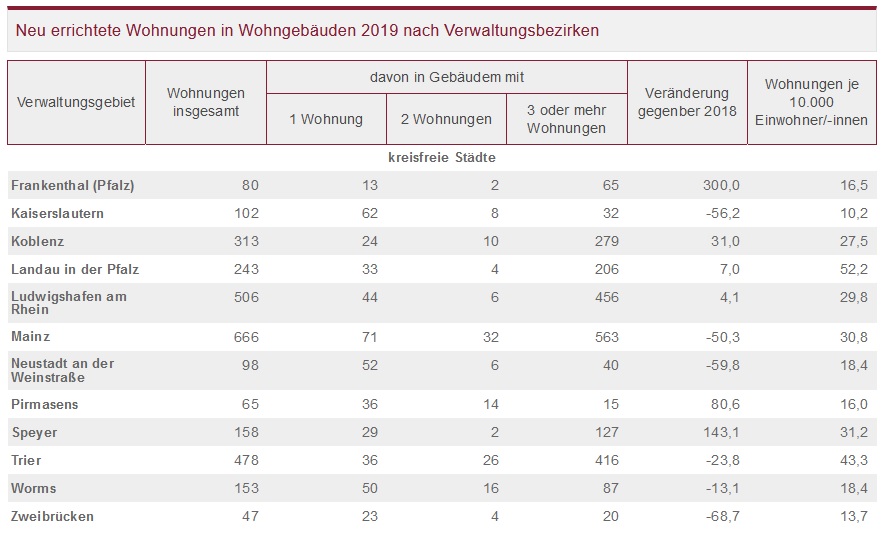Landesweit wurden im Neubau durchschnittlich 29 Wohnungen je 10.000 Einwohner fertiggestellt. Den höchsten Wert wies der Landkreis Mainz-Bingen mit 88 Wohnungen auf, den zweithöchsten Wert – gleichzeitig den höchsten unter den kreisfreien Städten – die Stadt Landau in der Pfalz mit 52 Wohnungen je 10.000 Einwohner. Die niedrigsten Werte verzeichneten die Landkreise Germersheim und Birkenfeld mit jeweils 9,5 Wohnungen je 10.000 Einwohner. Der drittniedrigste Wert – zugleich der niedrigste unter den kreisfreien Städten – errechnete sich für die Stadt Kaiserslautern mit 10,2 Wohnungen je 10.000 Einwohner.