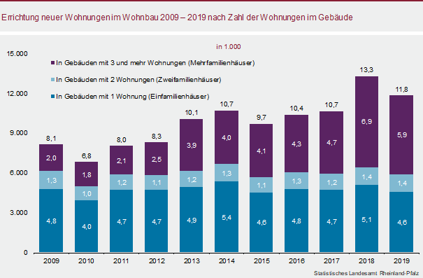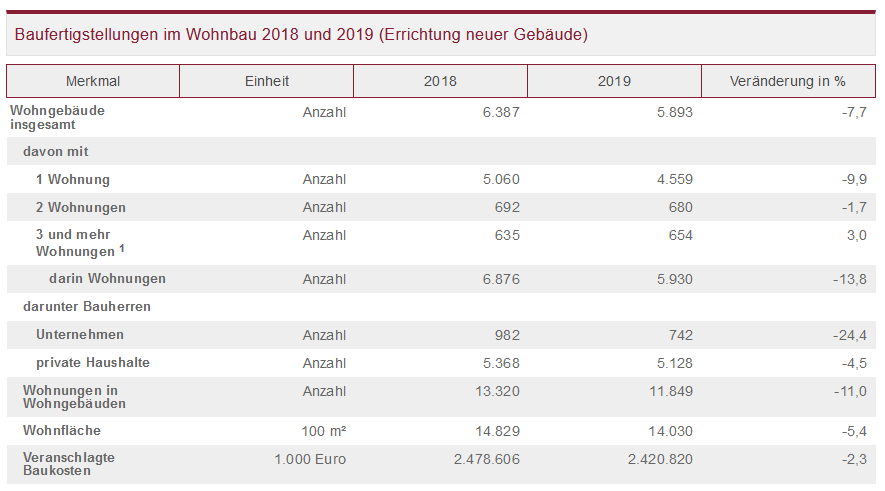 Im Jahr 2019 wurden den Meldungen der Bauaufsichtsbehörden zufolge weniger Bauvorhaben fertiggestellt als im Jahr zuvor. Wie das Statistische Landesamt mitteilt, entstanden in 5.893 neuen Wohngebäuden 11.849 Wohnungen. Die Anzahl der Wohnungen lag rund 11 Prozent unter dem Wert des Vorjahres und fiel damit wieder auf das Niveau des Jahres 2017 zurück. Etwa die Hälfte der Wohnungen entstanden in Mehrfamilienhäusern und Wohnheimen, rund 38 Prozent in Ein- sowie gut 11 Prozent in Zweifamilienhäusern.