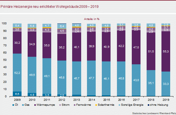 Im Jahr 2019 hat sich die Dominanz der neuen Wohngebäude mit Wärmepumpenheizung weiter verstärkt. Über 55 Prozent der fertiggestellten Neubauten hatten eine Wärmepumpe als primäre Heizquelle, mit Gas werden noch gut 33 Prozent der neuen Wohnungen beheizt. Im Jahr 2009 lag der Anteil der Wärmepumpenheizungen noch bei 30 Prozent und der Anteil der Gasheizungen bei 52 Prozent. Ölheizungen sind bei Neubauten mittlerweile nahezu bedeutungslos. Im Jahr 2019 lag ihr Anteil in Neubauten bei weniger als ein Prozent.