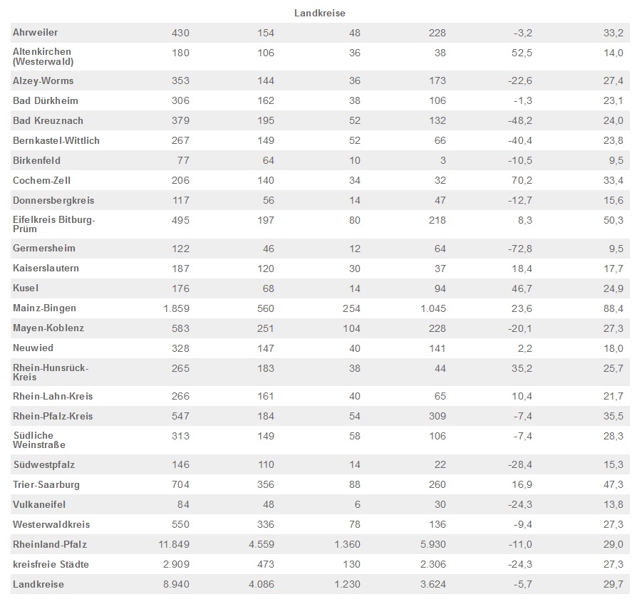 Die Geowebdienste des Statistischen Landesamtes liefern detaillierte Ergebnisse in Karten und Tabellen für die Kreis- und die Verbandsgemeindeebene. Neben dem aktuellen Jahr wird zur Veranschaulichung der mittelfristigen Entwicklung der Durchschnitt der vergangenen zehn Jahre dargestellt.