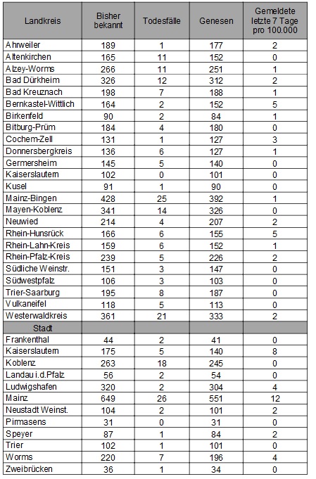 Die oben genannten Zahlen entsprechen den in der Meldesoftware des Robert Koch-Instituts übermittelten laborbestätigten Fällen einer COVID-19 Erkrankung mit Meldeadresse in Rheinland-Pfalz. Diese werden von den Gesundheitsämtern über die Landesmeldestelle beim Landesuntersuchungsamt an das Robert Koch-Institut übermittelt. Die Summe der in Rheinland-Pfalz bereits von COVID-19 Genesenen wird anhand eines Bewertungsalgorithmus ermittelt. Diese Angaben können von den Zahlen des Robert Koch-Instituts abweichen.