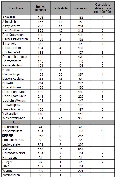 Die oben genannten Zahlen entsprechen den in der Meldesoftware des Robert Koch-Instituts übermittelten laborbestätigten Fällen einer COVID-19 Erkrankung mit Meldeadresse in Rheinland-Pfalz. Diese werden von den Gesundheitsämtern über die Landesmeldestelle beim Landesuntersuchungsamt an das Robert Koch-Institut übermittelt.