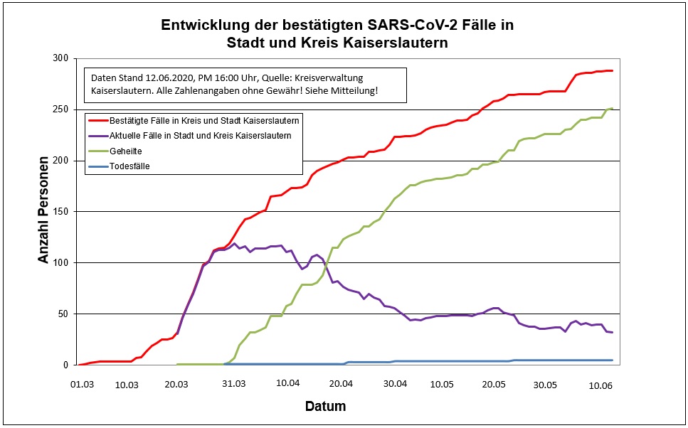 Zurzeit gibt es 288 Indexfälle in Stadt und Landkreis Kaiserslautern. Aufgrund landeseinheitlicher RKI-Vorgaben werden die 251 genesenen Personen und die mittlerweile 5 Todesfälle jedoch weiter in der Gesamtstatistik der positiven Fälle weiter mitgeführt.