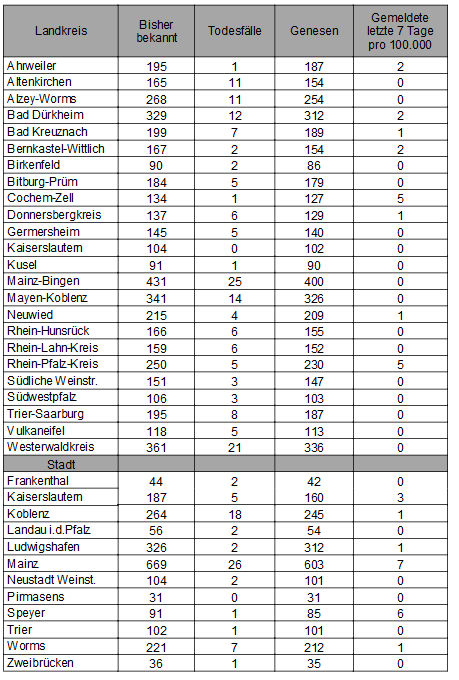 Die oben genannten Zahlen entsprechen den in der Meldesoftware des Robert Koch-Instituts übermittelten laborbestätigten Fällen einer COVID-19 Erkrankung mit Meldeadresse in Rheinland-Pfalz. Diese werden von den Gesundheitsämtern über die Landesmeldestelle beim Landesuntersuchungsamt an das Robert Koch-Institut übermittelt. Da die Mitarbeiterinnen und Mitarbeiter der Gesundheitsämter vor Ort am Wochenende und an Feiertagen in erster Linie mit der Ermittlung von Kontaktpersonen und Quarantänemaßnahmen gebunden sind, erfolgen die Meldungen zum Teil zeitverzögert.
