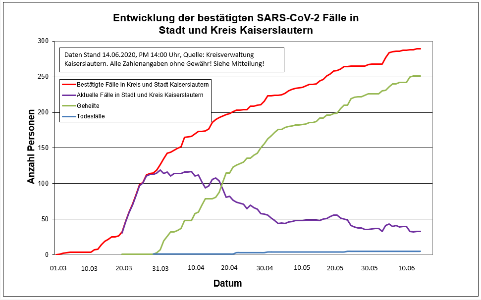 Heute meldete das Labor weder Neuinfizierte noch Genesene. Aktuell sind 33 Personen positiv getestet. Die Zahl der Genesenen liegt bei 251 Personen. Zurzeit gibt es 289 Indexfälle in Stadt und Landkreis Kaiserslautern. Aufgrund landeseinheitlicher RKI-Vorgaben werden die 251 genesenen Personen und die mittlerweile 5 Todesfälle jedoch weiter in der Gesamtstatistik der positiven Fälle weiter mitgeführt.