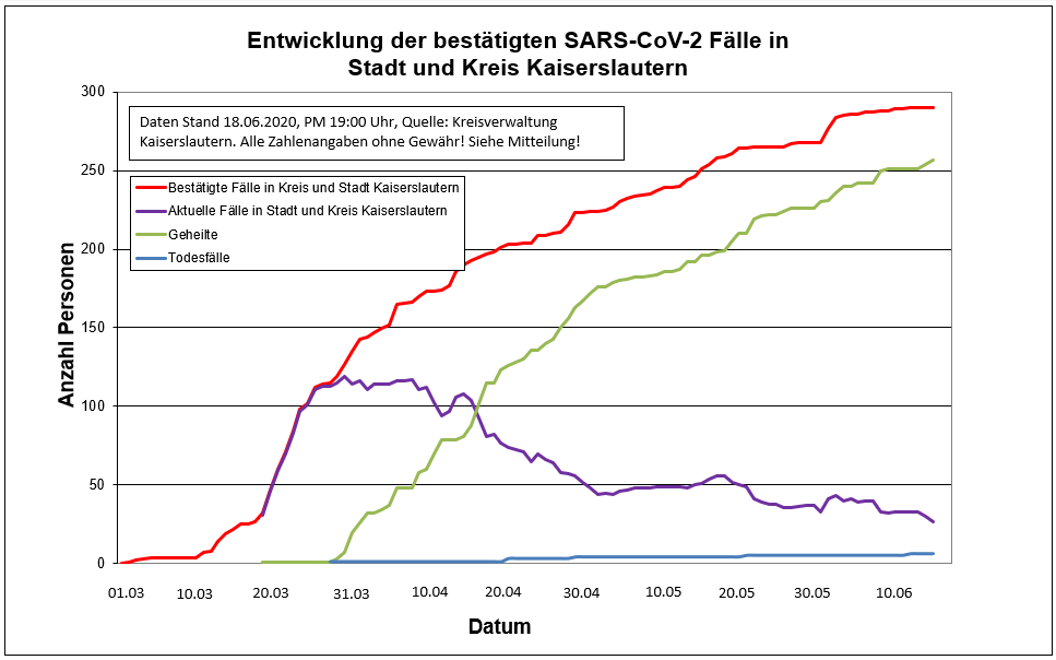 Zurzeit gibt es 290 Indexfälle in Stadt und Landkreis Kaiserslautern. Aufgrund landeseinheitlicher RKI-Vorgaben werden die 257 genesenen Personen und die mittlerweile 6 Todesfälle jedoch weiter in der Gesamtstatistik der positiven Fälle weiter mitgeführt.