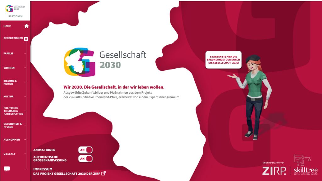 In welcher Gesellschaft werden wir im Jahr 2030 leben? Dieser Frage ist das Projekt „Gesellschaft 2030“ der Zukunftsinitiative Rheinland-Pfalz (ZIRP) nachgegangen. Ein Gremium von Expertinnen und Experten machte dazu die Dimensionen Zusammeneben, Gerechtigkeit und Teilhabe zu Schwerpunkten. Eine „Zukunftsmap Wir 2030“ veranschaulicht nun ausgewählte Zukunftsbilder: Auf einer eigenen Website sind in neun Stationen Projektergebnisse grafisch dargestellt, beispielsweise zu den Bereichen Familie, Generationen, Vielfalt und Wohnen und mehr. Eine Abschlusspubilkation soll im Juli veröffentlicht werden.