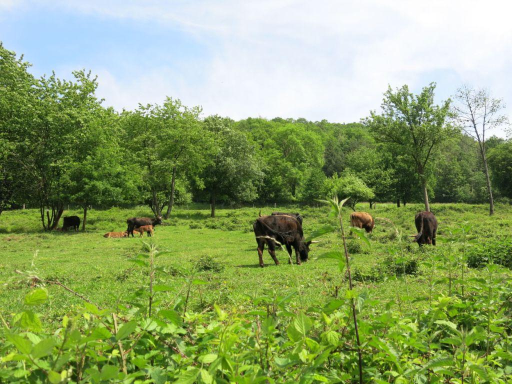 Im Einsatz für eine abwechslungs- und artenreiche Landschaft: Heckrinder auf der Beweidungsfläche „Am Wingertsberg“ bei Gräfenhausen (Foto: Biosphärenreservat/frei)