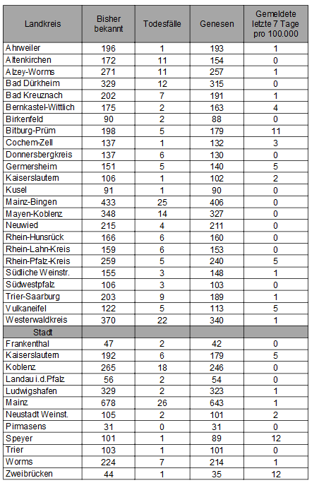 Die oben genannten Zahlen entsprechen den in der Meldesoftware des Robert Koch-Instituts übermittelten laborbestätigten Fällen einer COVID-19 Erkrankung mit Meldeadresse in Rheinland-Pfalz. Diese werden von den Gesundheitsämtern über die Landesmeldestelle beim Landesuntersuchungsamt an das Robert Koch-Institut übermittelt. Da die Mitarbeiterinnen und Mitarbeiter der Gesundheitsämter vor Ort am Wochenende und an Feiertagen in erster Linie mit der Ermittlung von Kontaktpersonen und Quarantänemaßnahmen gebunden sind, erfolgen die Meldungen zum Teil zeitverzögert.