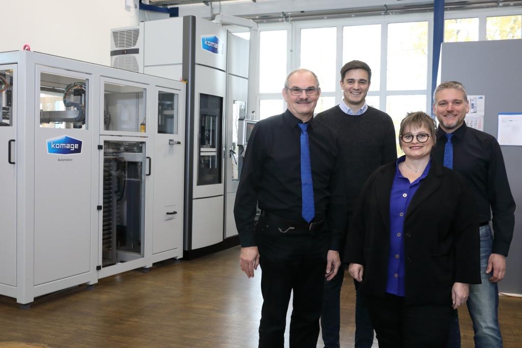 Bu: (v. l. n. r.): Jörg Lindemans, Prokurist und Betriebsleiter; Maximilian Lehnen, Projektleiter des Digitalisierungsprojekts mit dem Kompetenzzentrum Kaiserslautern; Margit Gellner-May, Geschäftsführerin von KOMAGE; Nicolas Hemmer, Prokurist und Bereichsleiter Entwicklung & Automation. Foto: Mittelstand 4.0-Kompetenzzentrum Kaiserslautern / A. Sell
