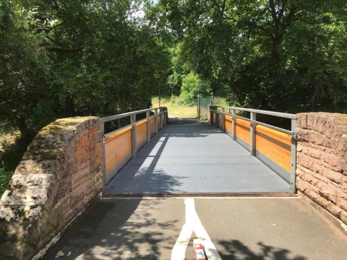 Die Stadtbildpflege Kaiserslautern hat die Fußgänger- und Radwegbrücke in Höhe der Straße Am Woogdamm saniert. Hierzu wurden die maroden Hauptträger aus Brettschichtholz entfernt und ein neuer rutschhemmender Belag auf der Brücke verlegt. Auf Grund der umfangreichen Arbeiten, war das Bauwerk voll gesperrt worden.