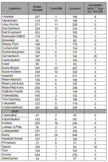 Die oben genannten Zahlen entsprechen den in der Meldesoftware des Robert Koch-Instituts übermittelten laborbestätigten Fällen einer COVID-19 Erkrankung mit Meldeadresse in Rheinland-Pfalz. Diese werden von den Gesundheitsämtern über die Landesmeldestelle beim Landesuntersuchungsamt an das Robert Koch-Institut übermittelt. Diese Zahlen können vereinzelt von den durch die Kreisverwaltungen kommunizierten Zahlen – wie aktuell im Kreis Germersheim – abweichen.