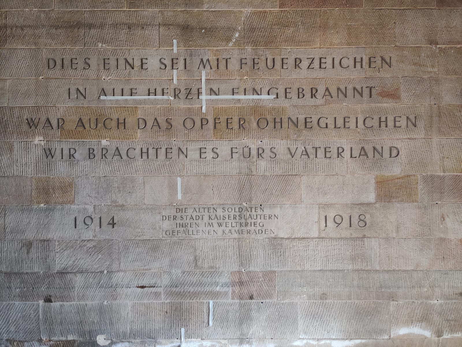 Dass eine Inschrift, die an die gefallenen Kaiserslauterer Soldaten im Ersten Weltkrieg erinnert, zu finden sein würde, war bekannt. Denn es gibt historische Innenaufnahmen aus der Zeit der Nutzung als sogenannte „nationalsozialistische Ehrenhalle“, die eine Standartennumrankte Inschrift zeigt. Nur war die Auflösung der Fotografien zu schlecht, um die in Vergessenheit geratene Inschrift entziffern zu können. Bei den laufenden Entkernungsarbeiten wurde die markige nationalistische Inschrift wieder lesbar. Sie lautet: „Dies eine sei mit Feuerzeichen in alle Herzen eingebrannt. War auch das Opfer ohnegleichen. Wir brachten es für das Vaterland. 1914 – 1918 Die alten Soldaten der Stadt Kaiserslautern Ihren im Weltkrieg gefallenen Kameraden.“
