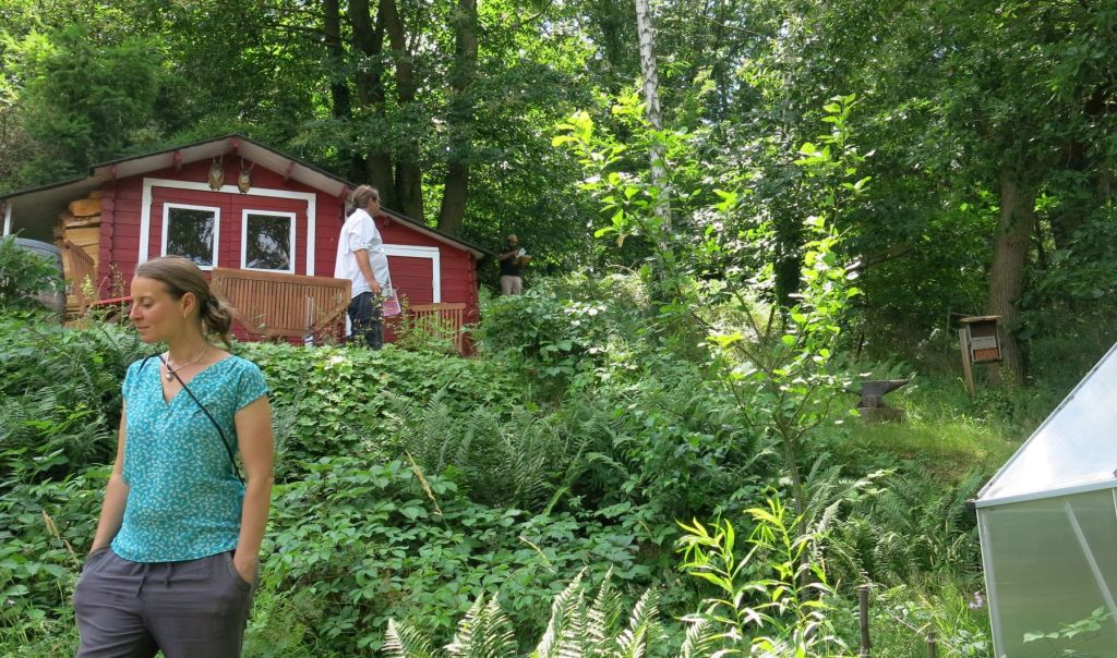 Der Garten von Familie Kitzel-Schwab ist direkt am Waldrand gelegen und über mehrere Terrassen über einen Hang verteilt. „Im oberen Bereich ist es recht schattig, hier müssen wir gar nicht gießen“, erklärt Sandrina Schwab. Neben der Waldrandlage macht sich die naturnahe Gestaltung des Gartens bezahlt: „Wir haben hier viel Vogelbesuch. Unter anderem schauen Mönchsgrasmücke, Neuntöter, Kernbeißer und Braunkehlchen bei uns vorbei“, freut sich die Gartenbesitzerin. Sprachliche Herausforderungen werden von den französischen und deutschen Jury-Mitgliedern schnell gemeistert, manchmal helfen die lateinischen Bezeichnungen als Brücke. Alle sind begeistert, dass hier das stark gefährdete Braunkehlchen, der „tarier des prés“, gesichtet wurde.