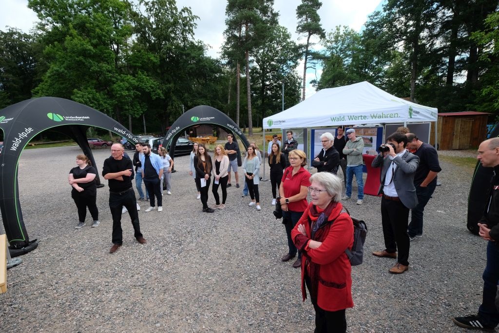 Unter der Ägide von Jun.-Prof. Dr. Christopher Robeller vom Fachbereich Architektur der TU Kaiserslautern machten sich 17 angehende Planer*innen der Arbeitsgruppe “Digitaler Holzbau” an die Aufgabe, für die weitere Nutzung des Forsthauses zukunftsfähige Konzepte zu entwickeln und ihm dabei ein neues architektonisches Kleid aus Holz zu geben. Die Herausforderung lag darin, den erhaltenswerten Bestand innovativ zu ergänzen. Die vor Ort gegebenen Rahmenbedingungen, wie Erholungsort in Einödlage, sportliche Aktivitäten (Mountainbiking, Wandern) und Gastronomie sollten berücksichtigt werden. Aber auch die Vision, Schwarzsohl als möglichen Bildungs- und Kommunikationsort für Schulen, Hochschulen und Universitäten nach der Fusion der beiden Universitäten in Kaiserslautern und Landau auszubauen, sollte erkennbar werden. Eine komplexe Aufgabe also für die angehenden Architekten*innen! Unterstützt wurden die Studierenden vom Geschäftsführer des Holzbau-Clusters Rheinland-Pfalz, Hannsjörg Pohlmeyer, Koblenz, der Leiterin des örtlich zuständigen Forstamts Kaiserslautern, Dr. Ute Fenkner-Gies, und Dr. Lothar Lukoschek, Landesbetrieb Liegenschaften und Baubetreuung (LBB). Sowohl die LBB-Vertreter*innen als auch die Verantwortlichen von Landesforsten versprechen sich gute Anregungen für die weitere Planung.