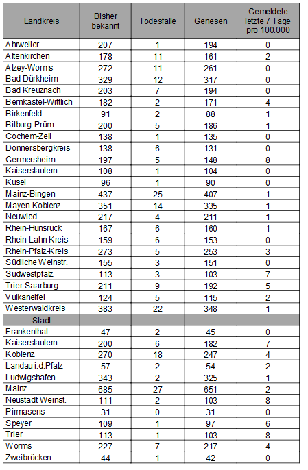 Die oben genannten Zahlen entsprechen den in der Meldesoftware des Robert Koch-Instituts übermittelten laborbestätigten Fällen einer COVID-19 Erkrankung mit Meldeadresse in Rheinland-Pfalz. Diese werden von den Gesundheitsämtern über die Landesmeldestelle beim Landesuntersuchungsamt an das Robert Koch-Institut übermittelt. Diese Zahlen können vereinzelt von den durch die Kreisverwaltungen kommunizierten Zahlen abweichen.