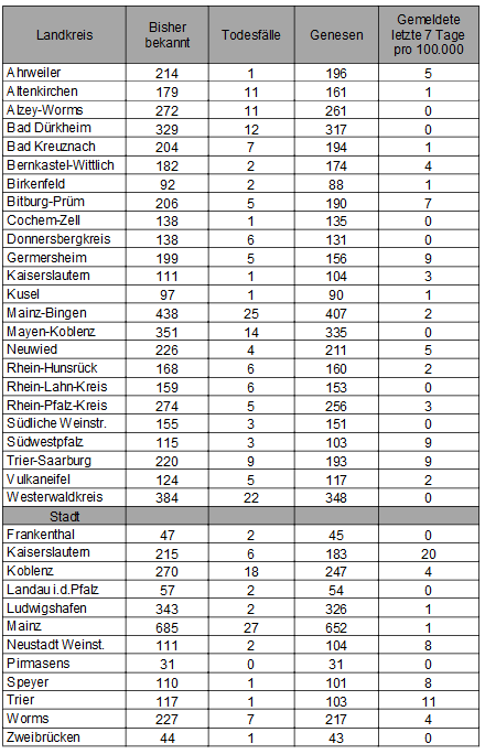 Die oben genannten Zahlen entsprechen den in der Meldesoftware des Robert Koch-Instituts übermittelten laborbestätigten Fällen einer COVID-19 Erkrankung mit Meldeadresse in Rheinland-Pfalz. Diese werden von den Gesundheitsämtern über die Landesmeldestelle beim Landesuntersuchungsamt an das Robert Koch-Institut übermittelt. Diese Zahlen können vereinzelt von den durch die Kreisverwaltungen kommunizierten Zahlen abweichen.