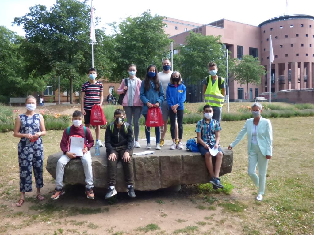 Das Foto zeigt Bürgermeisterin Beate Kimmel (rechts), Katharina Disch vom städtischen Bildungsbüro (links) und Joschka Bücklein, Tutor in der städtischen Sommerschule, mit einigen teilnehmenden Kindern.