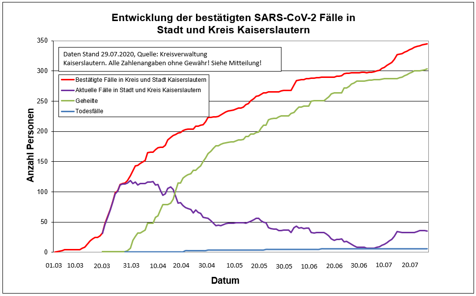 Im Zeitraum 25.- 29. 07. wurden 1 Person in der Stadt Kaiserslautern, und 4 Personen im Landkreis positiv getestet – und 5 Personen aus der Stadt und 1 Person aus dem Kreis konnten die Quarantäne verlassen .