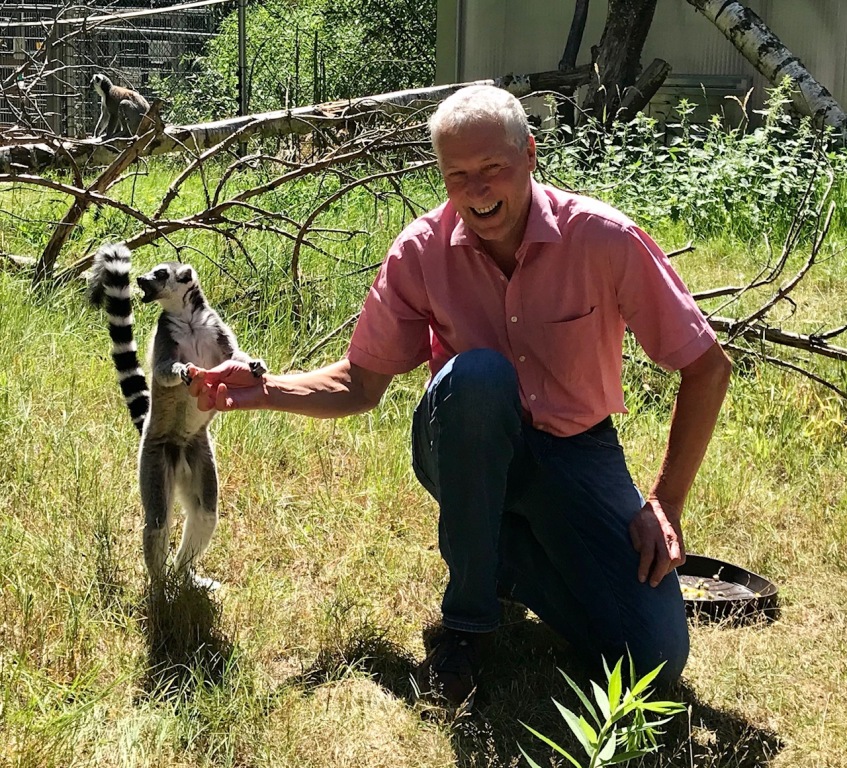 Bild: Beigeordneter Peter Kiefer mit seinem „Patenkind“, dem Lemurenäffchen King Julien im Siegelbacher Zoo.