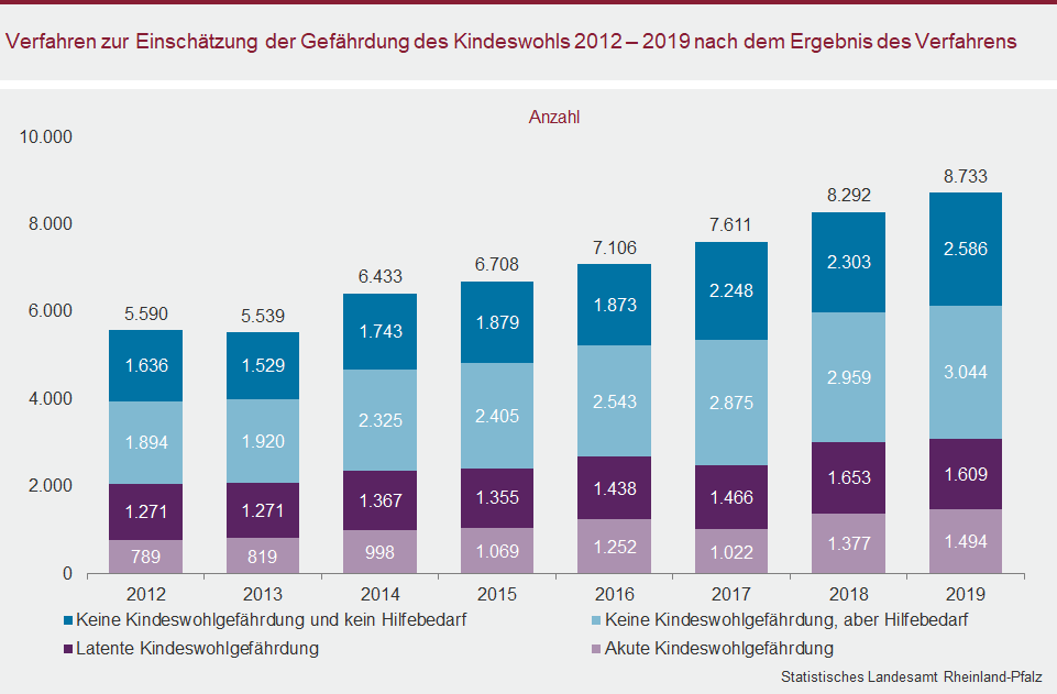 Im Jahr 2019 haben die rheinland-pfälzischen Jugendämter 8.733 Einschätzungen zur Kindeswohlgefährdung infolge gewichtiger Verdachtsmeldungen abgeschlossen. Laut Statistischem Landesamt Rheinland-Pfalz entspricht dies einem Anstieg um 441 Verfahren bzw. 5,3 Prozent im Vergleich zum Vorjahr.