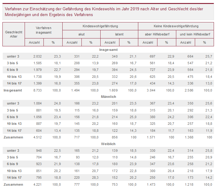 In 3.100 Fällen lag eine akute oder latente Gefährdung vor (plus 2,4 Prozent gegenüber 2018). Dabei stellten die zuständigen Fachkräfte bei 17 Prozent aller Verdachtsfälle eine akute Kindeswohlgefährdung fest. Weitere 18 Prozent wurden als latente Kindeswohlgefährdung eingestuft. Hier konnte die Frage, ob gegenwärtig tatsächlich eine Gefahr besteht, nicht eindeutig beantwortet, eine Gefährdung jedoch nicht ausgeschlossen werden. Für gut ein Drittel der Verfahren (35 Prozent) kamen die Experten zu dem Ergebnis, dass – wenngleich keine Gefährdung der Kinder festgestellt wurde – zumindest weiterer Unterstützungsbedarf notwendig war.