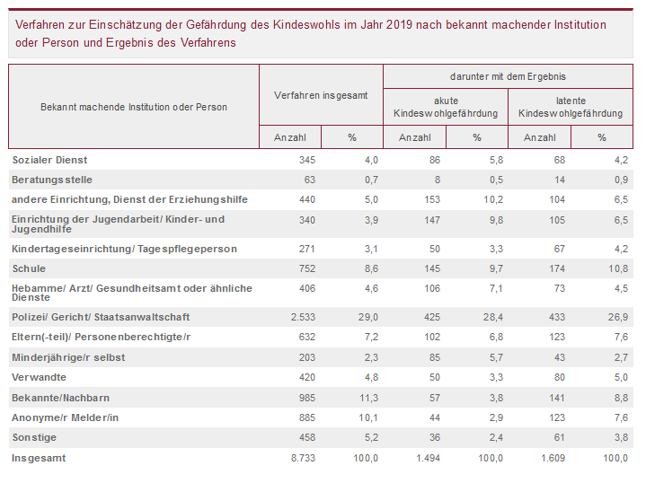 Mit 29 Prozent wurden die relativ meisten Verfahren auf Initiative von Polizei, Gericht oder Staatsanwaltschaft in die Wege geleitet. Danach folgen Verdachtsmeldungen von Bekannten oder Nachbarn sowie anonyme Meldungen mit Anteilswerten von elf Prozent bzw. zehn Prozent; neun Prozent der Ermittlungen wurde von Schulen angestoßen.