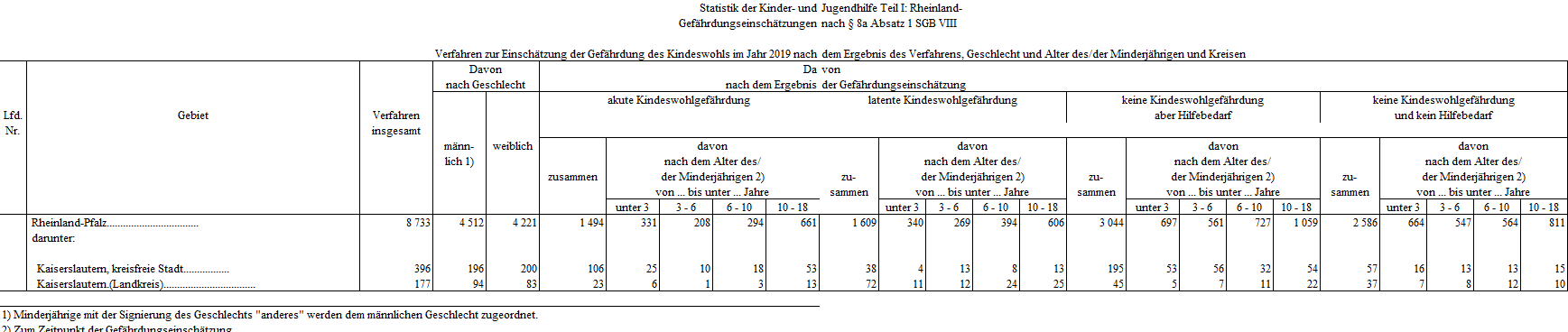 Zum 1. Januar 2012 trat ein neues Bundeskinderschutzgesetz in Kraft. Dieses Gesetz regelt verschiedene Maßnahmen, mit dem Ziel eines deutlich verbesserten Kinderschutzes. Auf der Grundlage des Kinderschutzgesetzes sind die Jugendämter verpflichtet, eine Gefährdungseinschätzung vorzunehmen, wenn gewichtige Anhaltspunkte für die Gefährdung des Wohls eines Kindes oder Jugendlichen vorliegen. Die Einschätzung des Gefährdungsrisikos erfolgt im Zusammenwirken mehrerer Fachkräfte. Eine Kindeswohlgefährdung liegt dann vor, wenn eine erhebliche Schädigung des körperlichen, geistigen oder seelischen Wohls des Kindes bzw. Jugendlichen bereits eingetreten oder mit ziemlicher Sicherheit zu erwarten ist. Über alle Verfahren zur Einschätzung einer Kindeswohlgefährdung ist bei den öffentlichen Trägern der Jugendhilfe (Jugendämtern) jährlich eine Erhebung durchzuführen (§ 98 Absatz 1 und § 99 Absatz 6 SGB VIII). Für die Statistik sind in Rheinland-Pfalz 41 Jugendämter auskunftspflichtig. Die Erhebung erstreckt sich auf die innerhalb eines Kalenderjahres abgeschlossenen Verfahren zur Einschätzung einer Kindeswohlgefährdung. Da hier Daten des Jahres 2019 betrachtet werden, sind Aussagen über mögliche Auswirkungen der Einschränkungen aufgrund der Corona-Pandemie nicht enthalten.