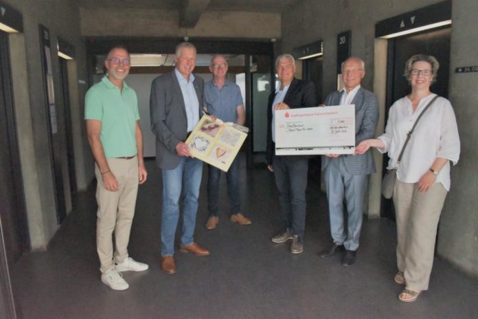 Bild: Nahmen den Spendenscheck gerne entgegen (v.r): Angelika Döngi, Prof. Dr. Dr. Hartmut Link und Thomas Bauer vom Förderverein Mama/Papa hat Krebs. Im Gegenzug freuten sich (v.l.) Christian Littek, Peter Kiefer und Gerhard Heinelt von der Stadt über das überreichte Geschenk: ein Bild mit von Bürgern gemalten Herzen.