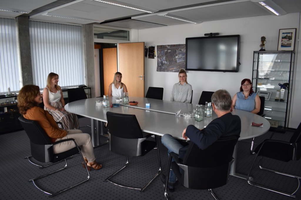 BU: In lockerer Atmosphäre haben OB Klaus Weichel und die Leiterin des Referats Personal, Karin Woll, heute Morgen die vier neuen Auszubildenden begrüßt.
